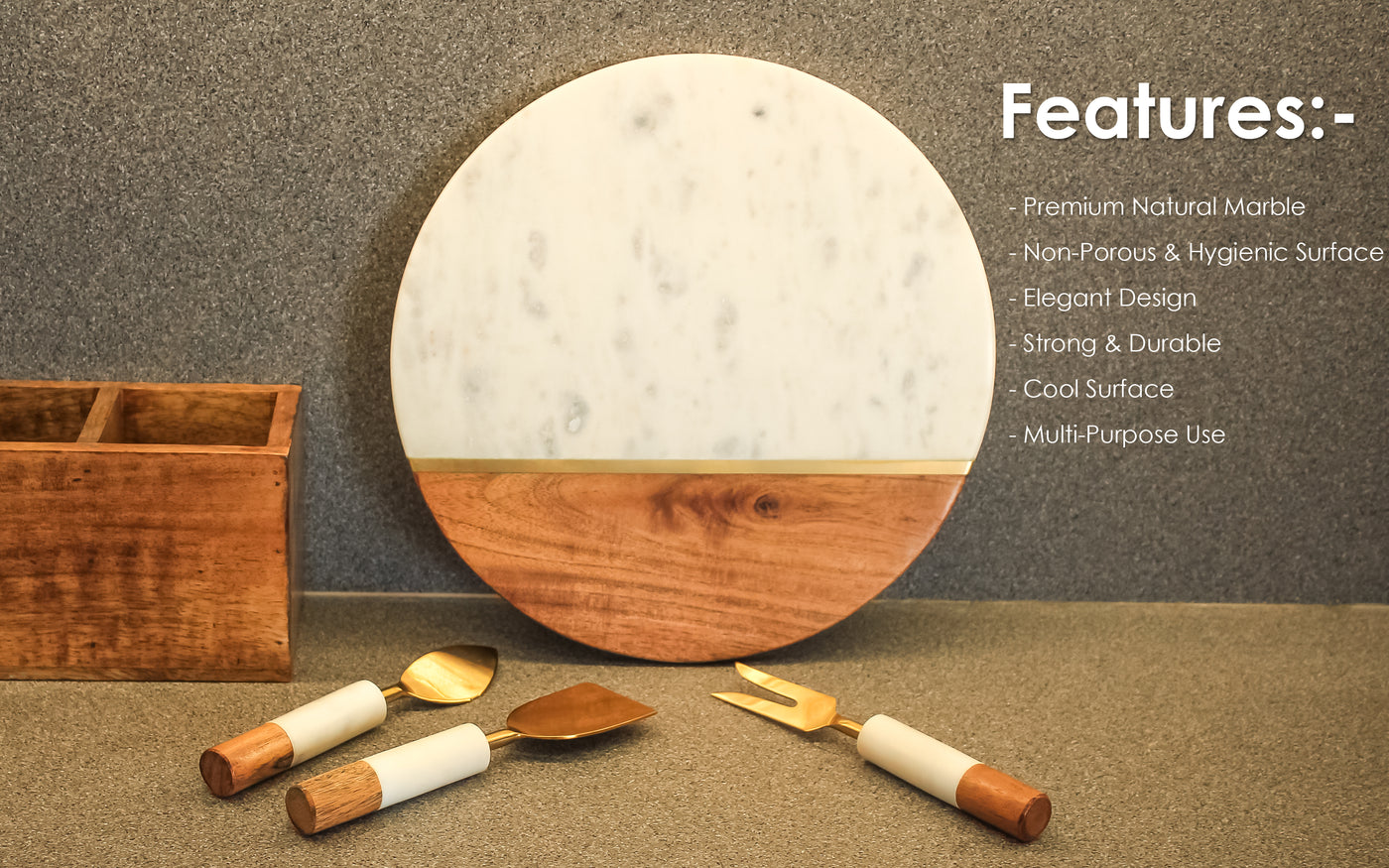 Material: Wood & Marble; Shape: Rectangle & Circle; Design: Modern; Colour: Black & Brown Type: Premium Chopping Board – A stylish and functional addition to your home décor.