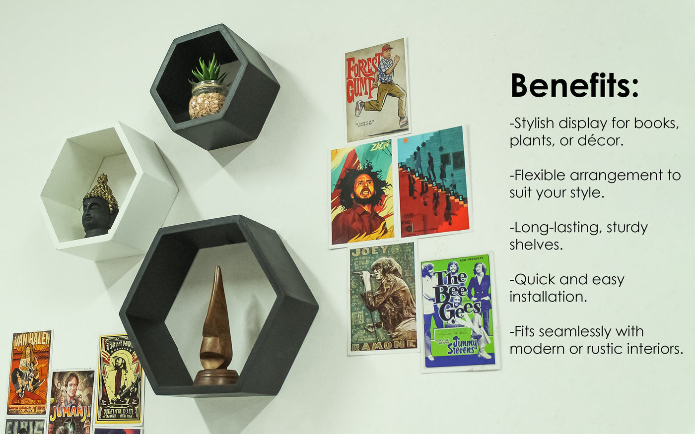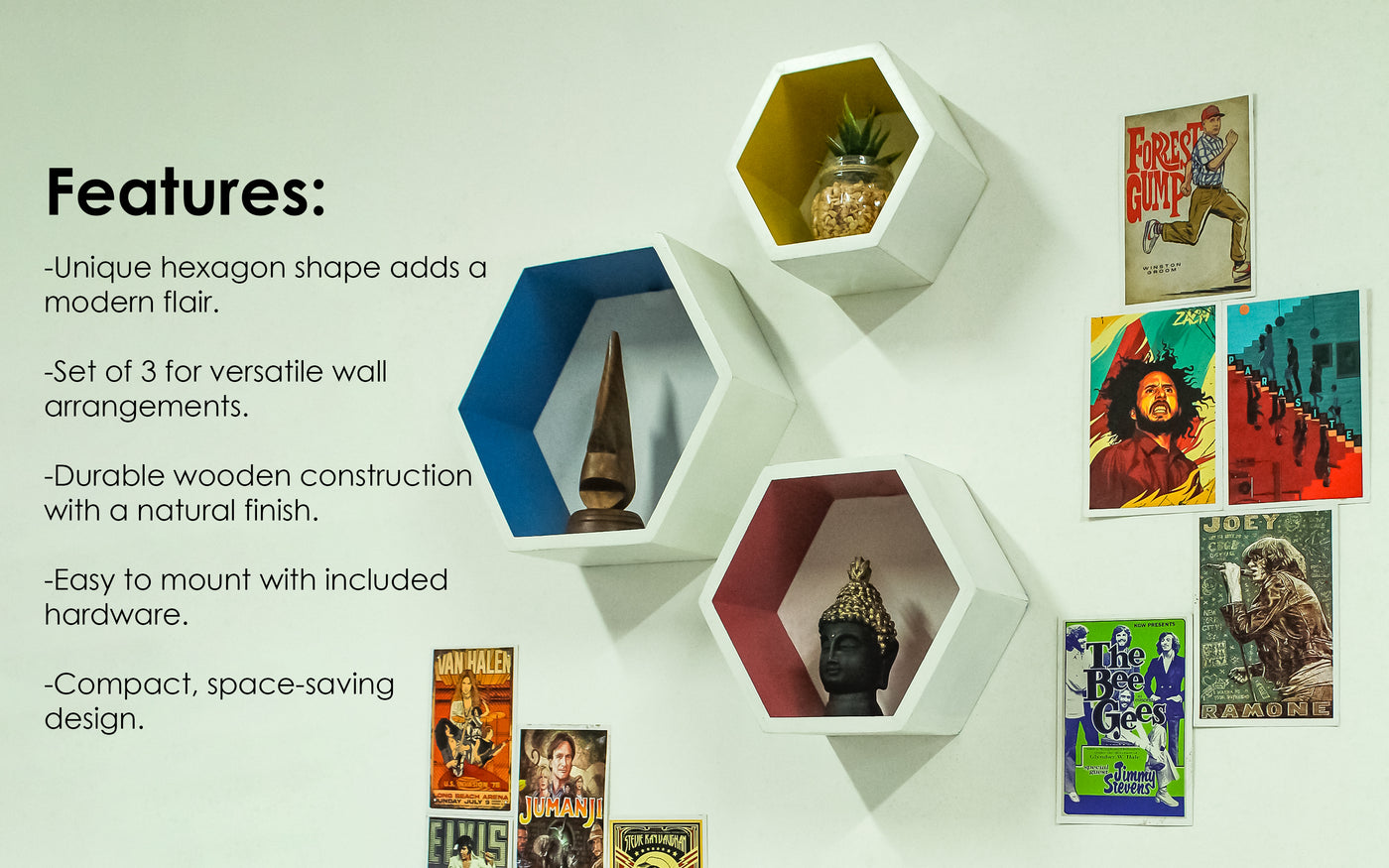 - Unique Hexagon Design: A set of 3 beautifully crafted wooden hexagon shelves that add a modern geometric touch to any wall.