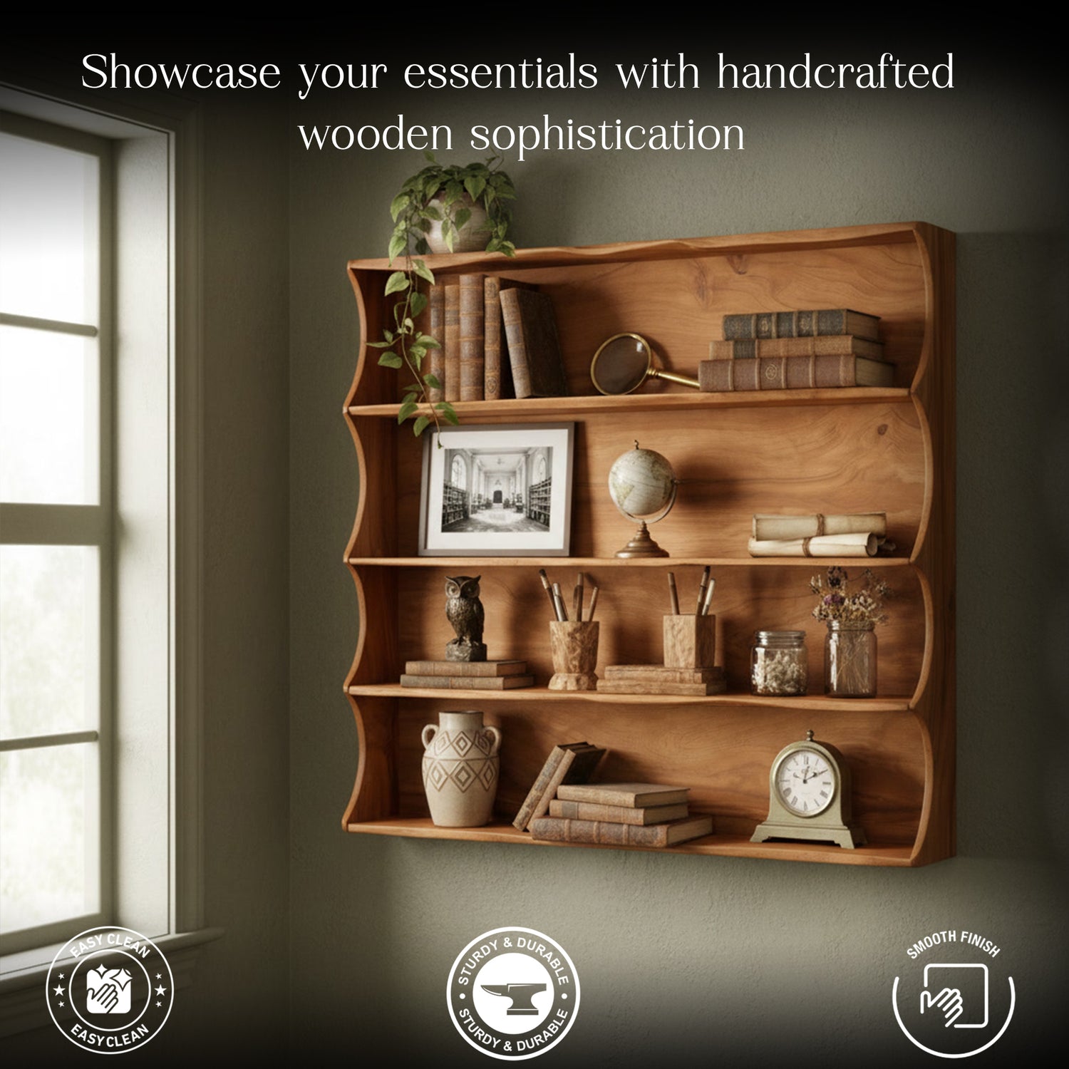 Handcrafted Solid Wood Wall Shelf – Elegant Floating Bookshelf for Living Room, Study & Office – Decorative Storage & Display Rack