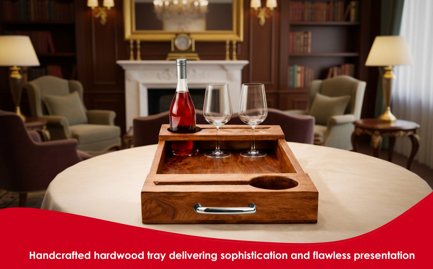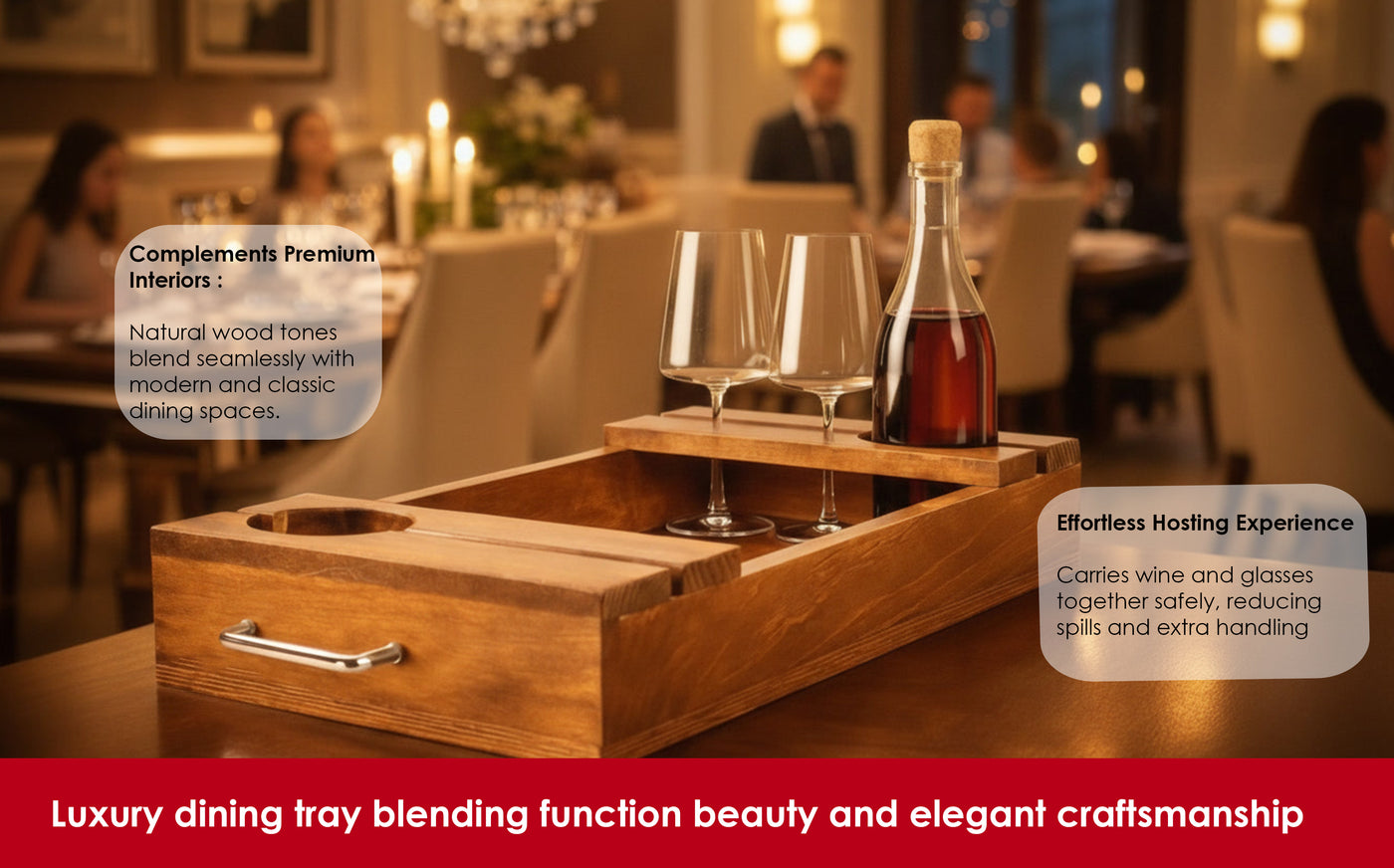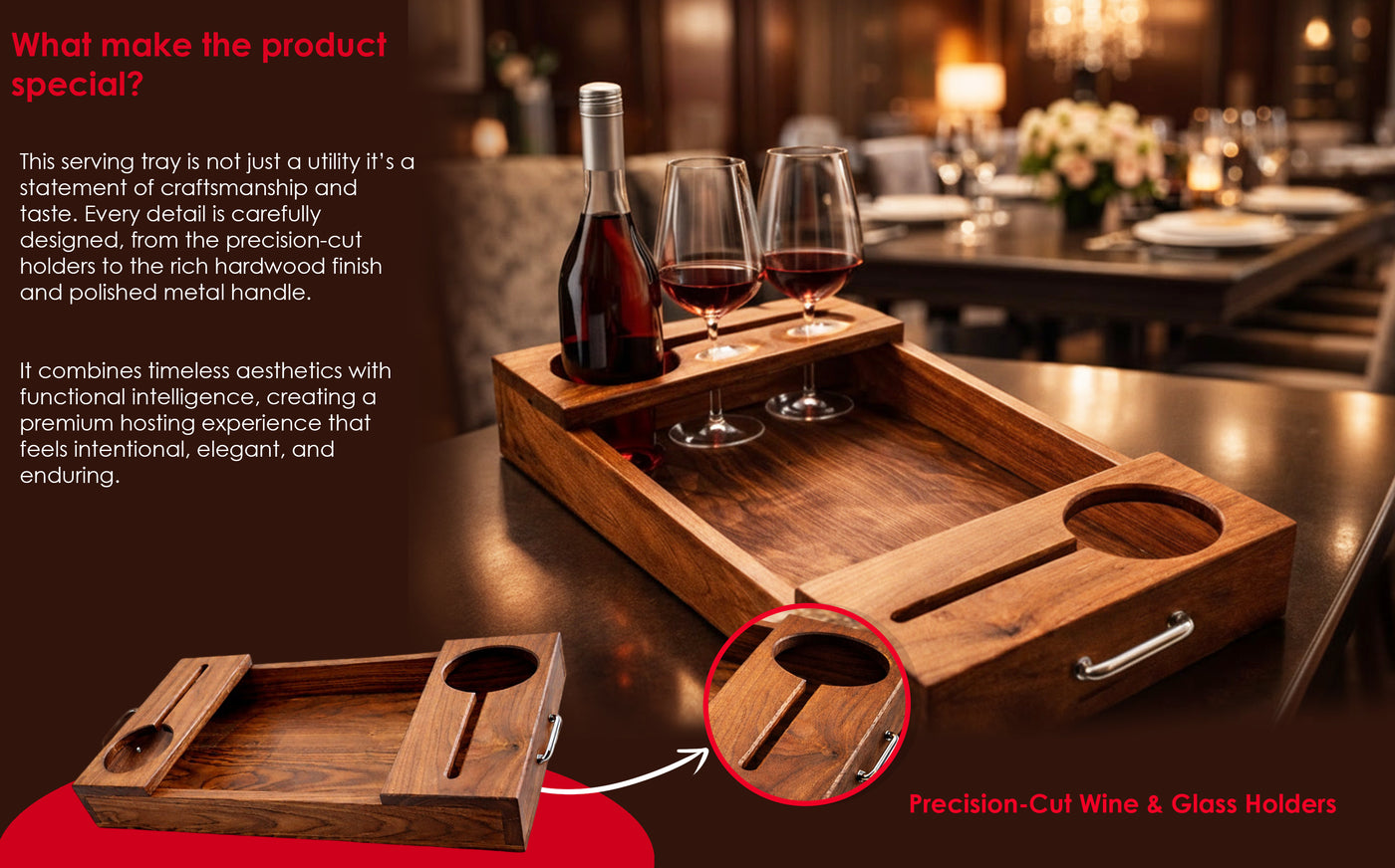 All-in-One Wine Serving Tray – Designed with dedicated slots for 2 wine bottles and wine glasses, making hosting effortless and organized.