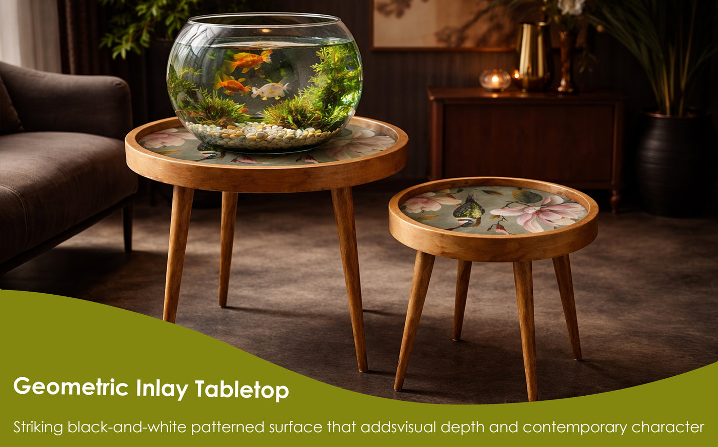 Handcrafted Wooden Round Coffee Table Set of 2 – Solid Wood Nesting Side Tables with Decorative Inlay Top for Living Room & Balcony