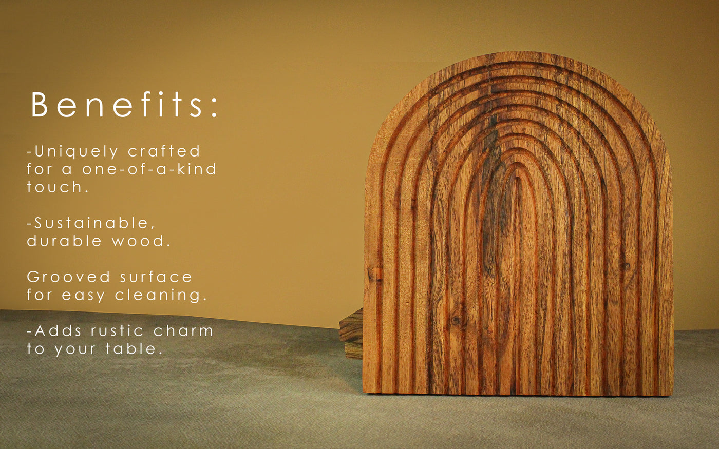 • NATURAL HEALTHY WOOD: Made from sustainable Acacia wood, this durable wooden board offers long-term use with a stylish and beautiful design that brightens up any corner of your kitchen or home. Its unique grooved design with smooth edges ensures both sturdiness and elegance.