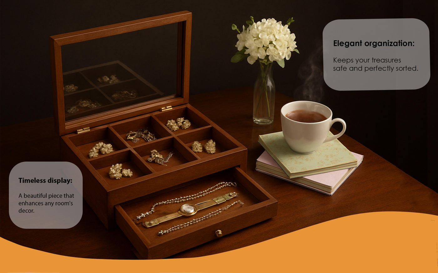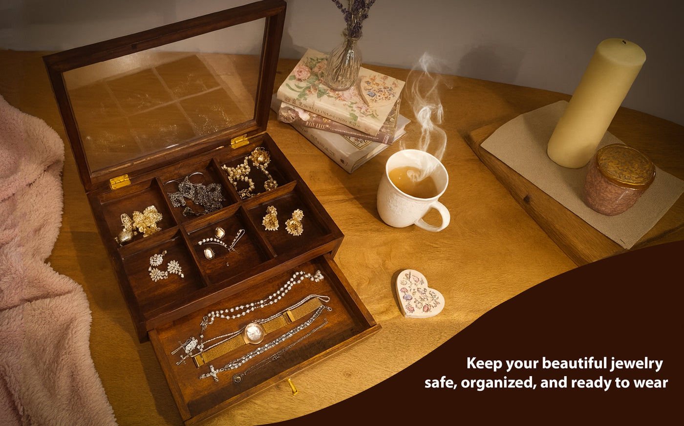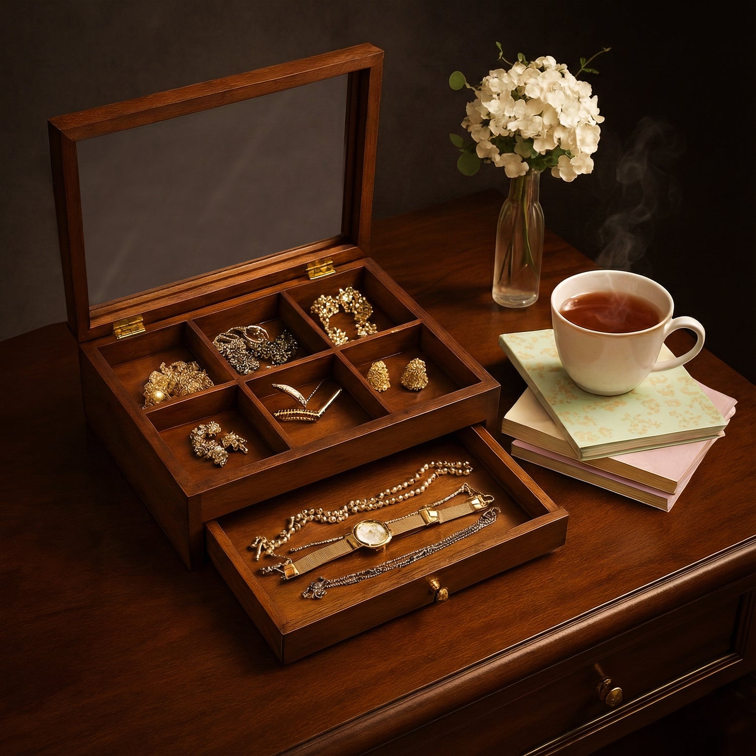 Smooth Sliding Drawer – Features a pull-out drawer with a sturdy brass handle, offering extra storage and easy access to frequently used jewelry.