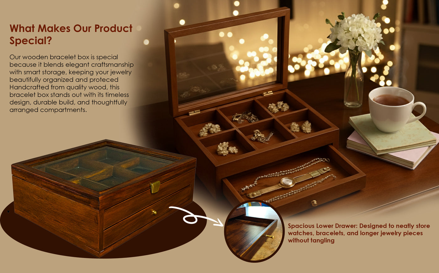 Smart Multi-Section Storage – Designed with multiple compartments to neatly organize bracelets, bangles, chains, rings, and small accessories without tangling.