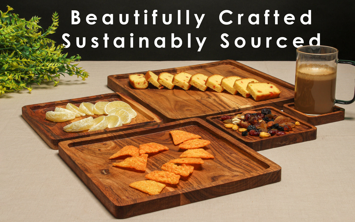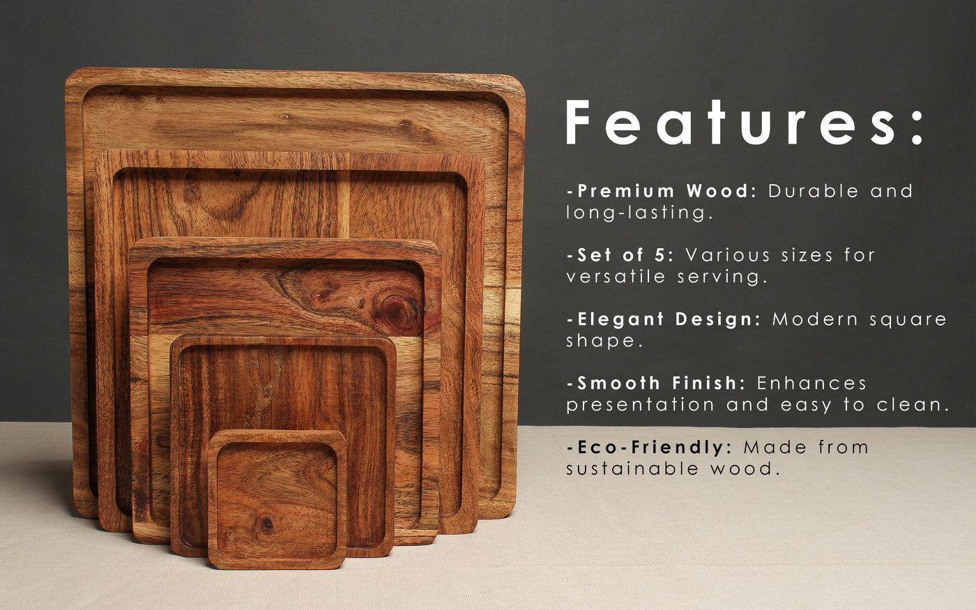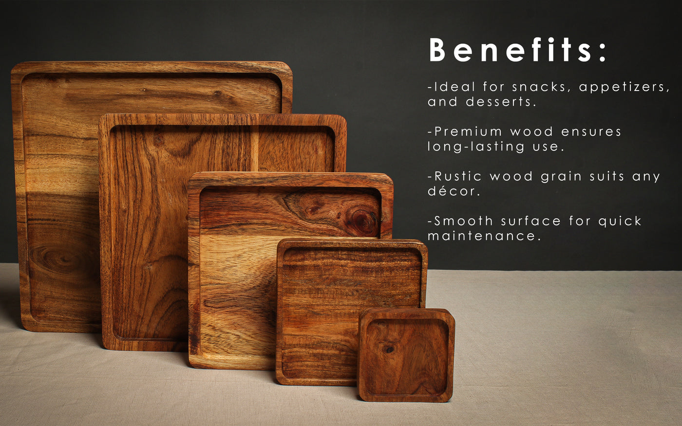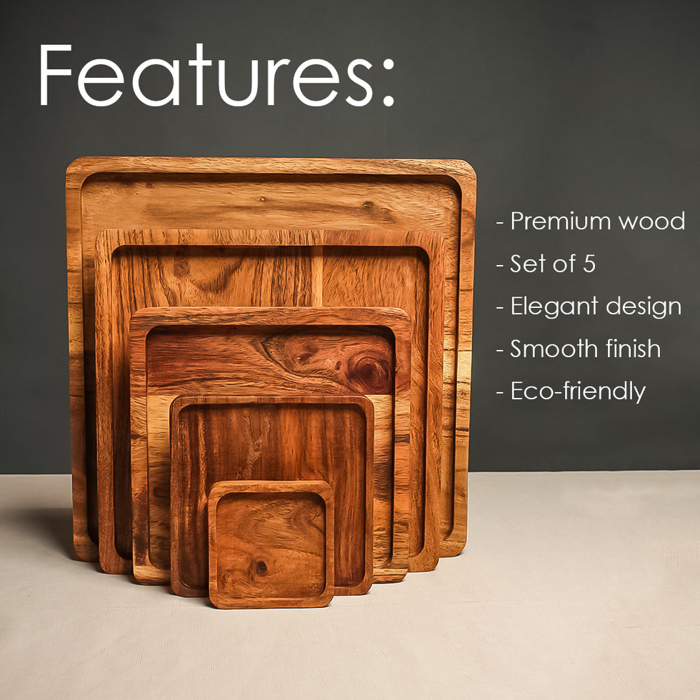- Set of 5 Wooden Platters: This set includes five stylish square wooden serving trays, ideal for hosting parties, displaying snacks, appetizers, or desserts on a decorative wooden platter.