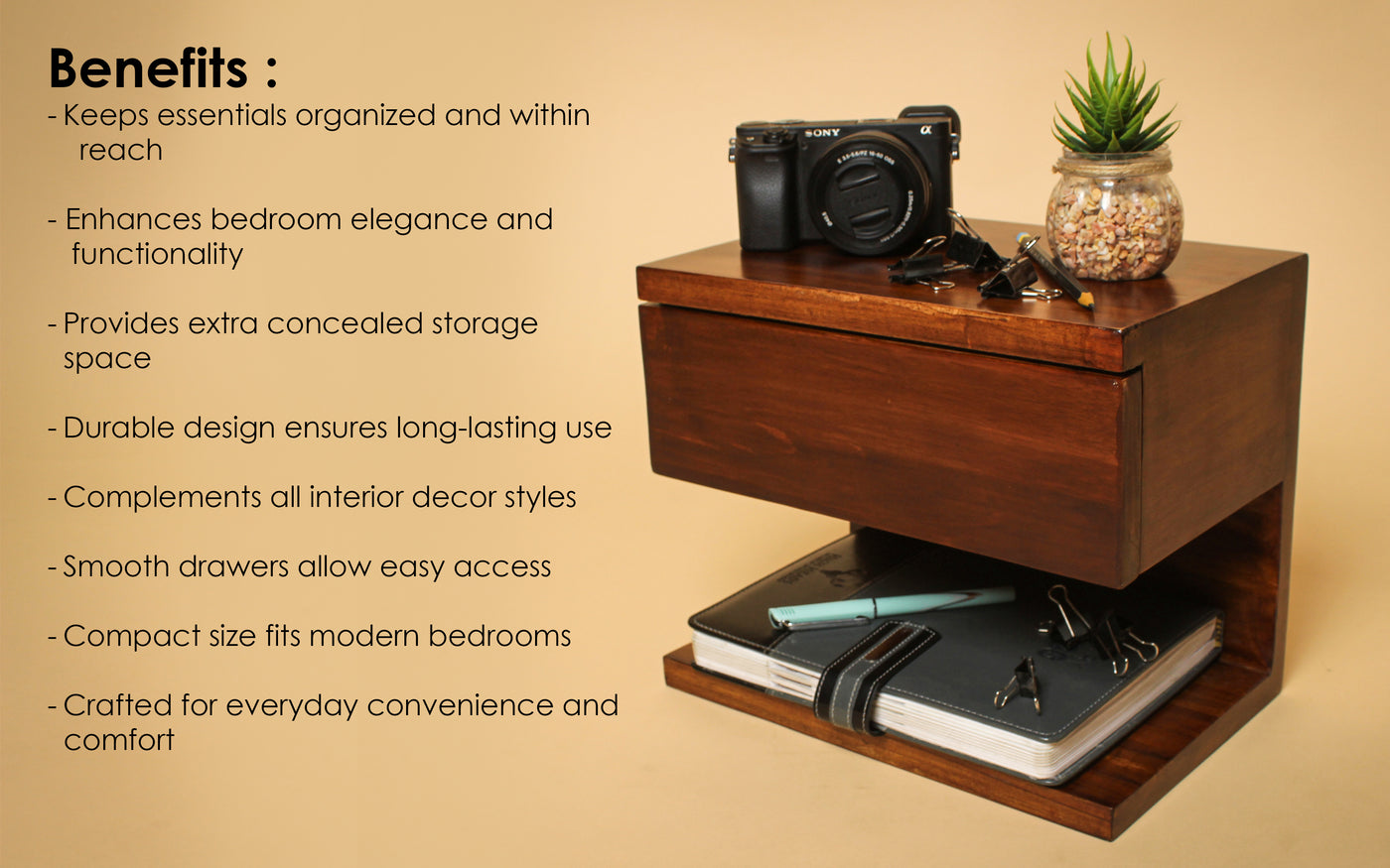• Functional Storage: Comes with a built-in drawer for storing essentials like keys, chargers, or accessories, and an open shelf for décor or daily-use items.