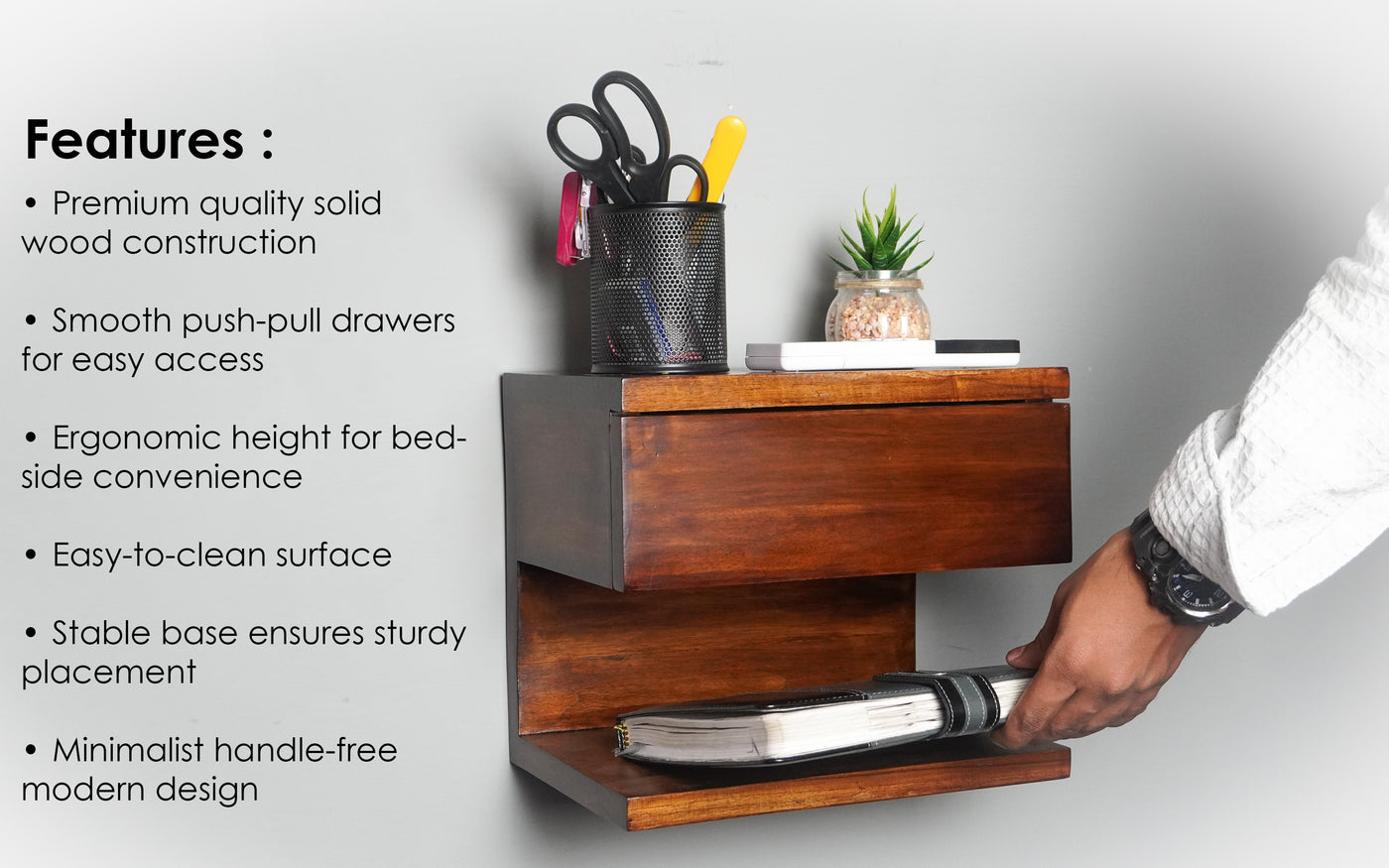 • Versatile Use: Perfect for use as a bedside shelf, entryway organizer, or wall-mounted nightstand, blending beautifully with modern and rustic interiors.