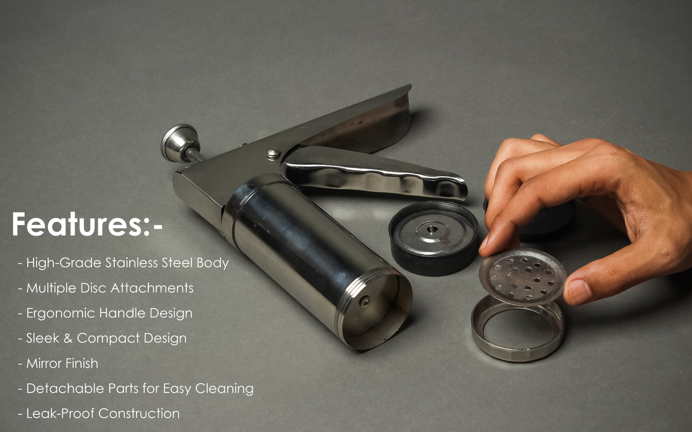 Stainless Steel Kitchen Press for Noodles, Murukku, Namkeen, and Snacks- Manual Sancha Sev Chakli Gathiya Sevaiya Maker- Silver Kitchen Tool