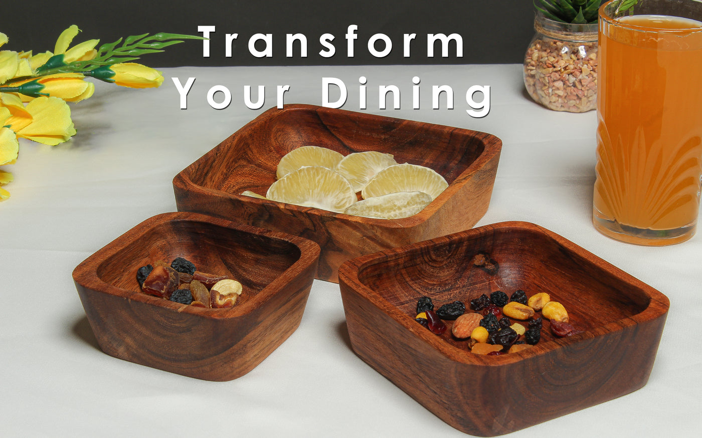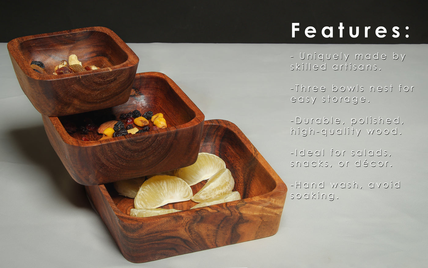 - Set of 3 Wooden Bowls: This set includes three beautifully handcrafted wooden bowls in different sizes, perfect for serving salads, snacks, fruits, and more.