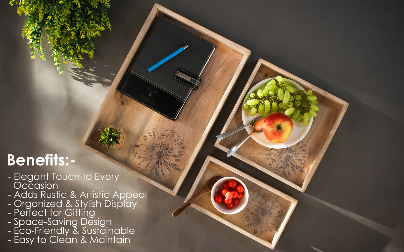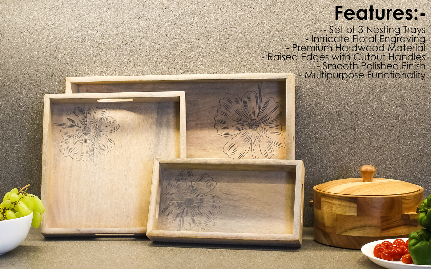 ✨Nesting & Space-Saving – Set of three trays designed to stack neatly for convenient storage when not in use.