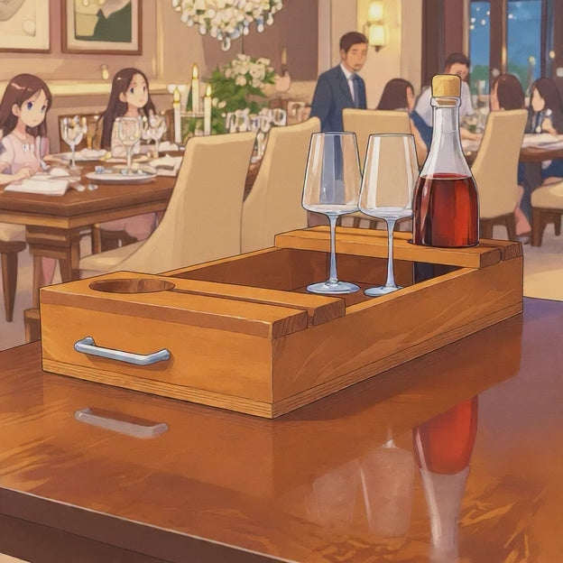 All-in-One Wine Serving Tray – Designed with dedicated slots for 2 wine bottles and wine glasses, making hosting effortless and organized.